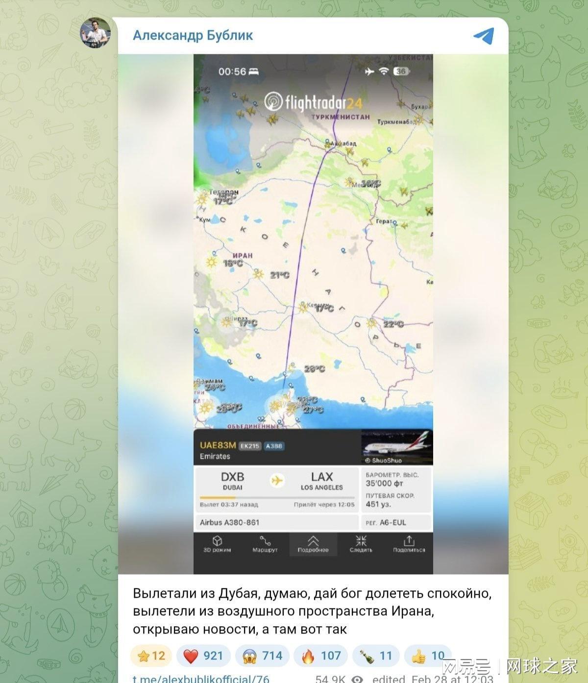然而,这条航线让他与战争有了一次擦肩而过的交集。"我们离开迪拜时心想:'如果上帝允许,这趟飞行会平安无事。'"布勃利克在自己的Telegram频道上回忆道,"我们才刚飞离伊朗领空,我就看了新闻,目睹了发生的一切。"